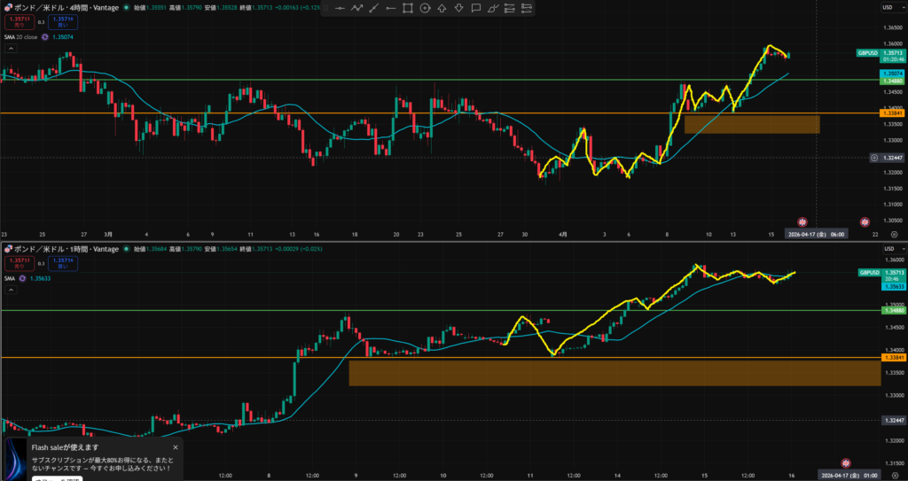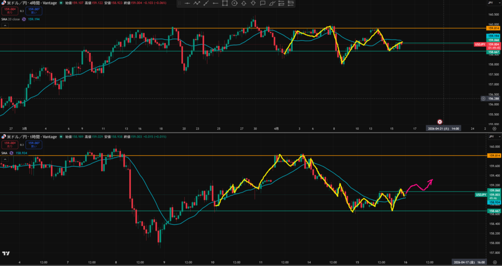 - 狙い:1時間三角持ち合いを上にブレイク待ち