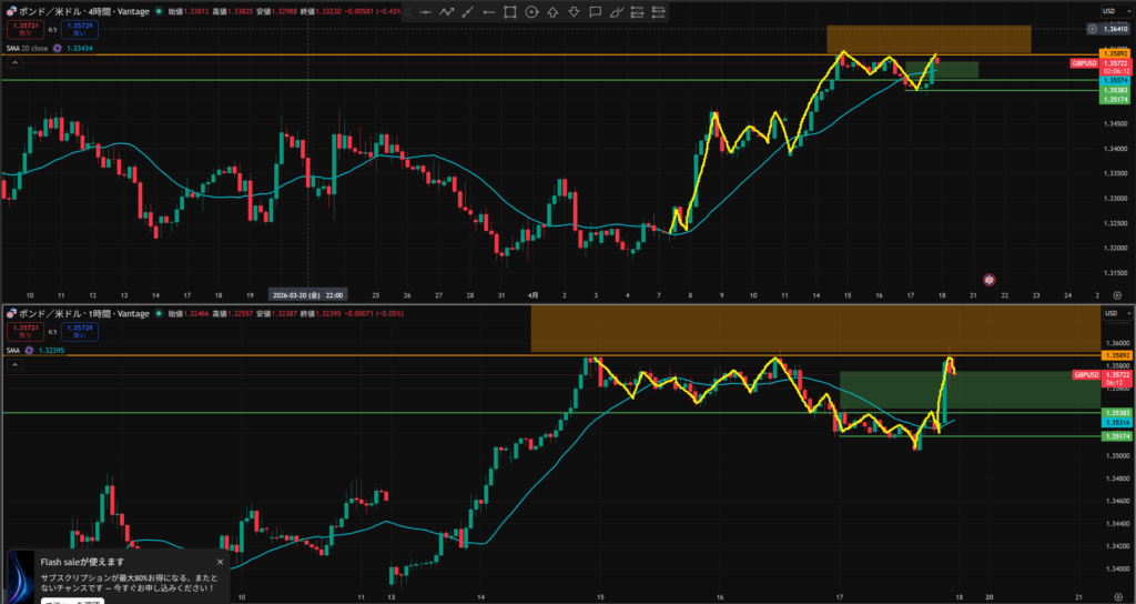 - 黄ラインの下に買い支え勢力+週足レベルの押し目下位勢力