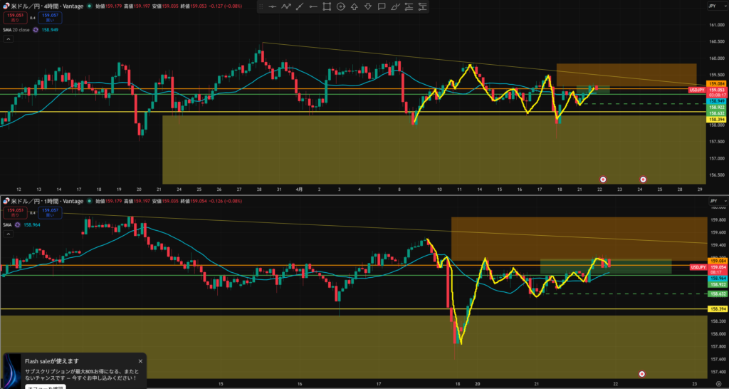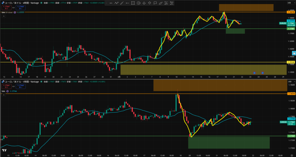 - 4時間、1時間ともにMAで売り抑えられて下降してきた