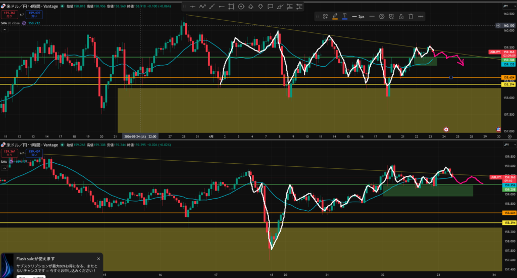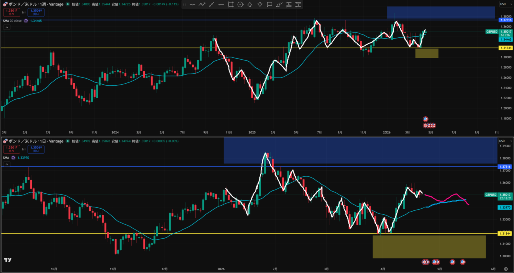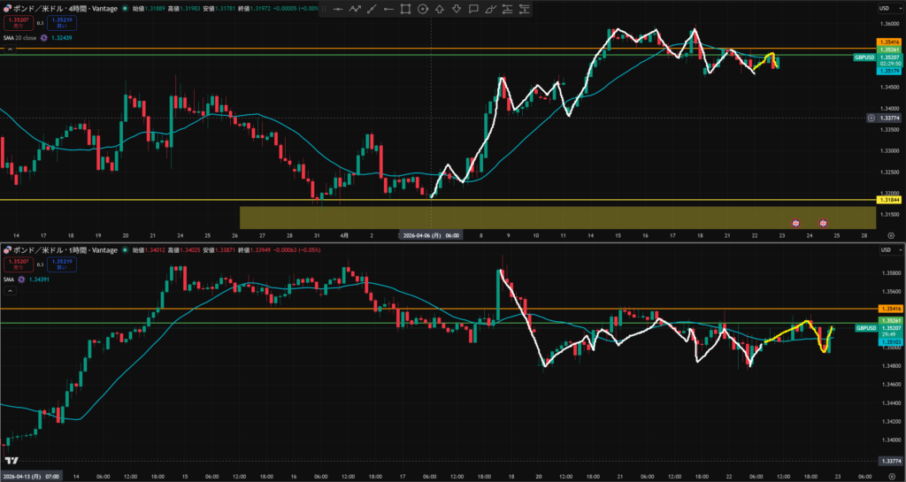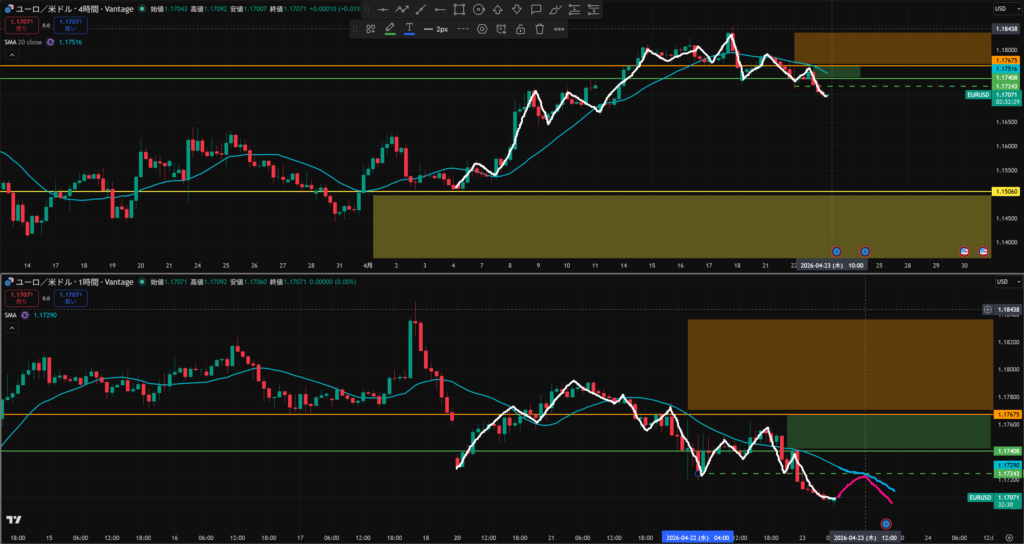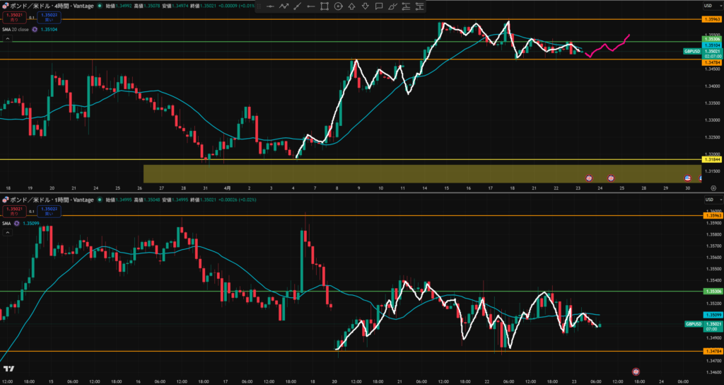 - オレンジ線(上段)の上に売り抑え勢力、オレンジ線(下段)に押し目買い勢力