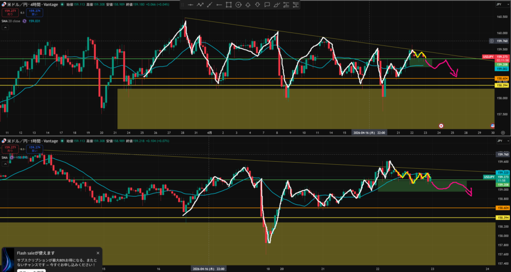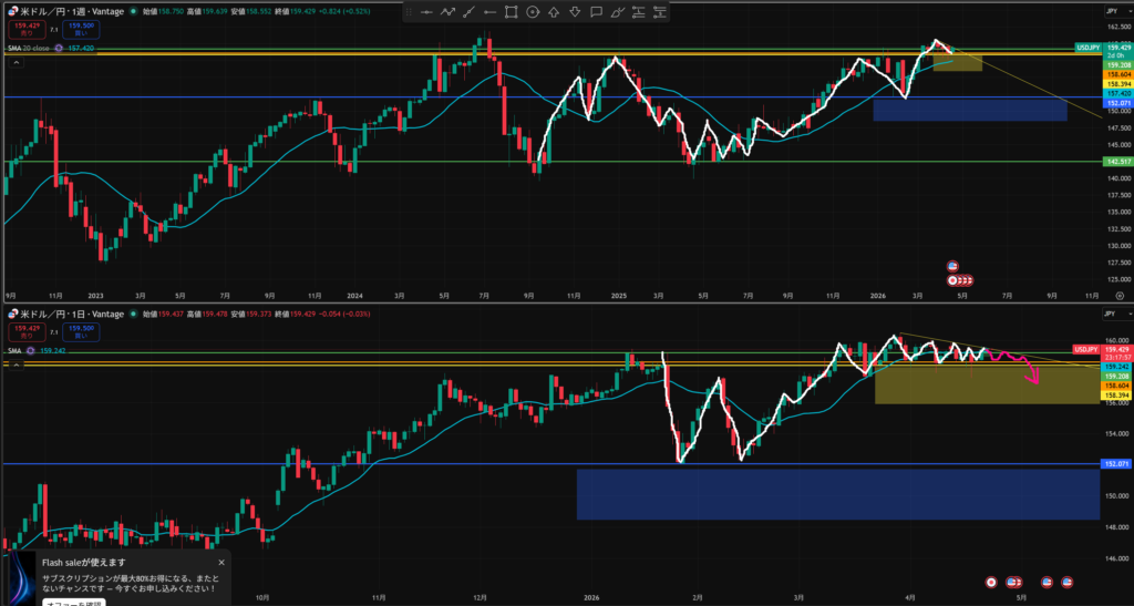 - 黄ラインの下に買い支え勢力+週足レベルの押し目下位勢力